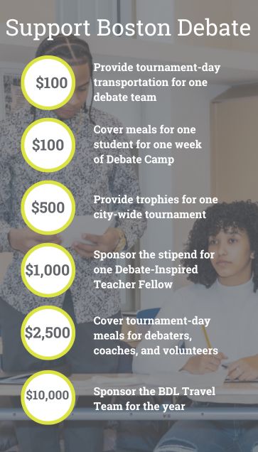 The Boston Debate League is a registered 501(c)3 organization, tax ID #59-3789722. All donations are tax-deductible to the extent allowed by law.